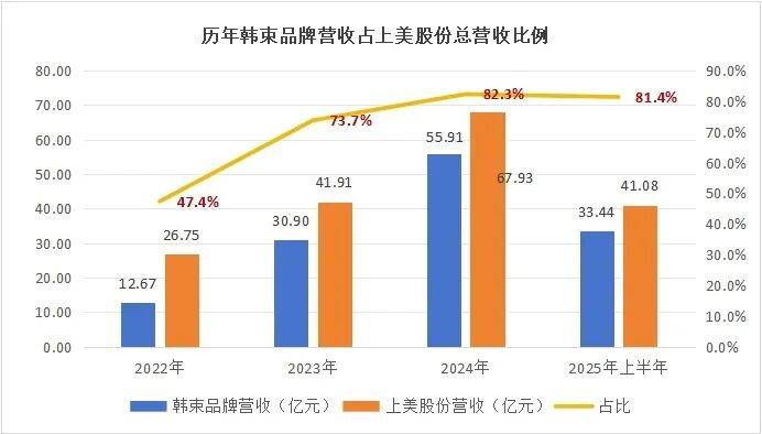 但在亮眼成绩单下,几乎是韩束品牌在△▽◆“独舞▪”。从2022年的47•★.4%,到2023年的73□★.7%,韩束的营收占比逐年攀升。2024年韩束营收55.91亿元=☆,占公司总营收比重高达82.3%▽◁▷,同比增长80.9%▲;2025年上半年,韩束营收33.44亿元☆,占比仍维持在81▪□△.4%,同比增长14-●.3%。