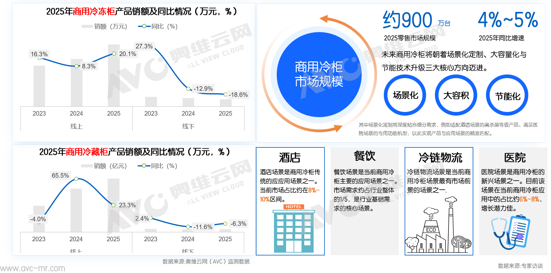 从商用板块来看,当前我国商用冷柜市场零售规模约900万台,行业正朝着场景化、大容量化与节能化方向深度升级。从监测数据来看看▷…,2025年线上商用冷冻柜销售额同比大增20.1%,展现出强劲的线上拓展潜力,线%,逐步趋于稳定;商用冷藏柜线%,反映出小型商户线上采购需求的快速释放,但线下仍延续下滑趋势,降幅为6.3%。下游应用场景中,餐饮是核心刚需场景,发展稳健;酒店需求与行业复苏周期高度绑定;冷链物流和医院作为新兴增长场景具备较较强的发展潜力=◇□。