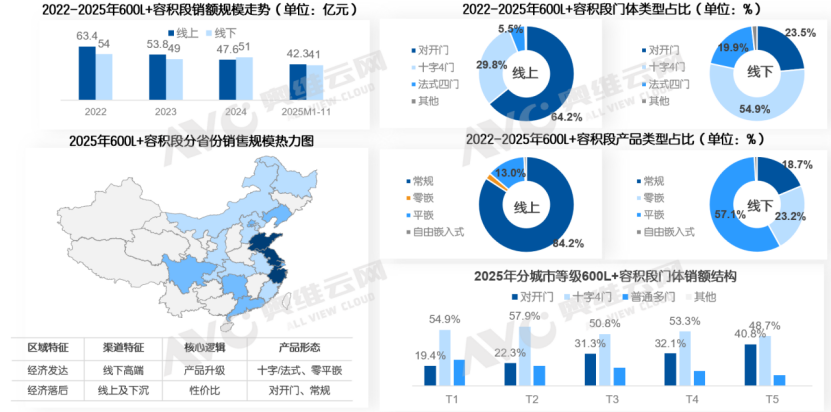 而600L以上的大容积冰箱品类存在两种差异化业务逻辑:在经济发达区域◁,锚定产品升级路径,主打法式多门、十字四门等高端机型,通常搭载平嵌等适配现代家居的核心配置◇;在消费力相对滞后的地区▪□,则遵循性价比竞争逻辑,以常规对开门机型为核心供给,精准匹配当地市场的消费需求◇▪。