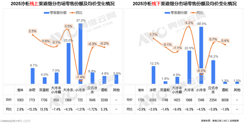 从冷柜市场格局来看,2025年刚需型冷柜整体规模萎缩态势显著,线下渠道陷入量价齐跌的困境,线上渠道则呈现价格小幅上涨的趋势。与之形成对比的是◇■,品需型冷柜市场呈波动增长态势,2025年呈现量增价减的特征,其中冰吧品类的需求增长最为突出,成为拉动该细分市场增长的核心动力。