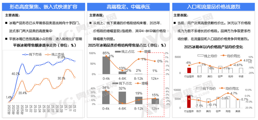 当前,冰箱产品形态呈现高度聚焦的趋势▼,在高端市场以技术壁垒稳固基本盘,中端市场受性价比诉求挤压承压明显•,而低端入门级产品则已逼近盈利红线○。从嵌入式的角度来看,2025年在大盘环境疲软的当下,平嵌冰箱产品渗透率持续上行△,值得注意的是••,美的平嵌冰箱在线年监测销量第一。从线上线下价格段表现看,市场增幅呈U型分布,4-8K中端价格带降幅最为显著▼▽。用户决策逻辑高度向性价比倾斜,3000元以下价格段成为少数实现增长的区间,品牌为争夺市场份额,在流量品与入门品领域的价格竞争趋于白热化。