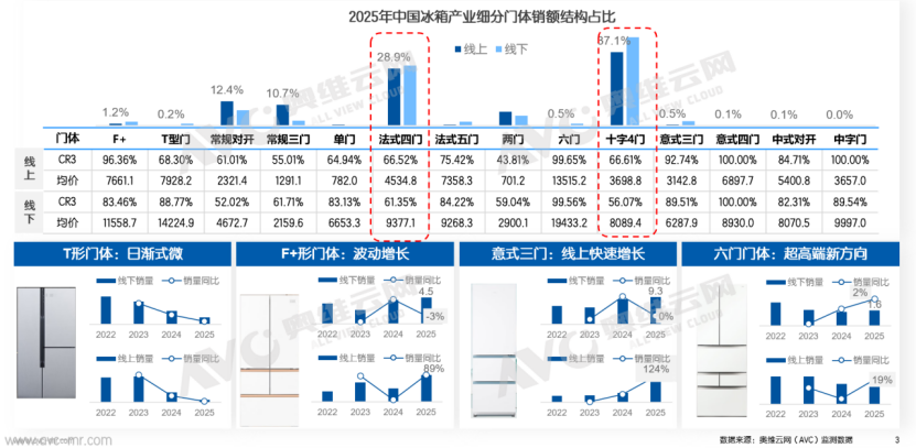 从门体结构维度来看,…“十字四门□☆、法式多门▷•”产品稳居市场主流地位,线%,线%◇◆,成为冰箱品类的价值中枢核心载体。在此格局下■,其他门体类型的市场份额正加速被挤压出清。与此同时,F+◆△▽、意式三门、六门等特色门体类型具备较高关注价值,其销售规模呈现波动上升的发展态势,正逐步打开细分市场的增长空间。
