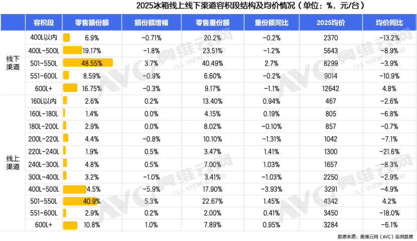 从容积段发展趋势来看,冰箱产品已高度聚焦501-550L容积段,且呈现持续集中的态势,2025年根据奥维云网统计数据显示==,501-550L容积段线L以内容积段虽零售额规模有限,但市场销量仍维持在较高水平。当前市场置换需求占据主导,用户多为“一台换一台●☆☆”的更新换代,安装空间无新增余量,对产品占地面积有着严格限制▽▪。旧品替代存在核心痛点:传统产品容积与功能同质化严重,难以激发用户置换意愿。叠加房地产市场下行的影响•▽,用户居住空间进一步受限,在有限占地的前提下--,对更大有效容积的需求愈发迫切▷,以此满足家庭食材存储的升级诉求…-。与此同时•,用户需求正从基础存储向场景升级转变,从单纯的能装转向更精细化的好用,产品需匹配现代家居场景,搭载个性化功能。