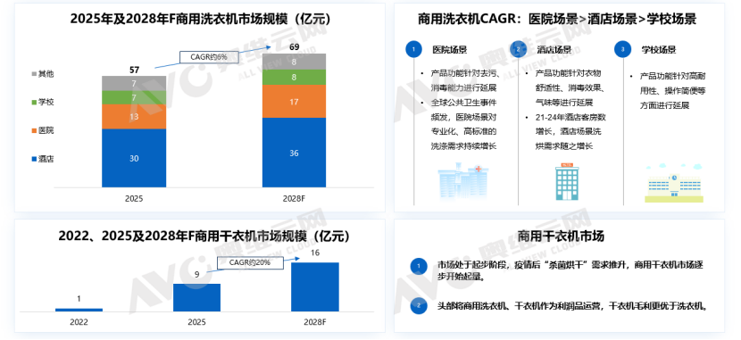 当家用市场面临高位回调的压力时,商用洗烘市场虽然整体规模尚小■,却呈现出截然不同的增长逻辑,商用洗衣机市场受医院•■△、酒店■=、学校等不同场景的个性化●▷、专业化需求深度切割,呈现出显著的结构性增长机遇。据专家访谈及数据推算□,2025年商用洗衣机市场规模约为57亿元•★☆,到2028年预计达到69亿元水平◆,复合增长率约6%;商用干衣机市场则刚刚起步,自2025年不到10亿元◇•,预计2028年达到16亿元水平★,增长速度较快△☆□。无论商用洗衣机市场还是商用干衣机市场,都处于高毛利水平-,对于头部厂商而言都是持续培育的高利润产品。