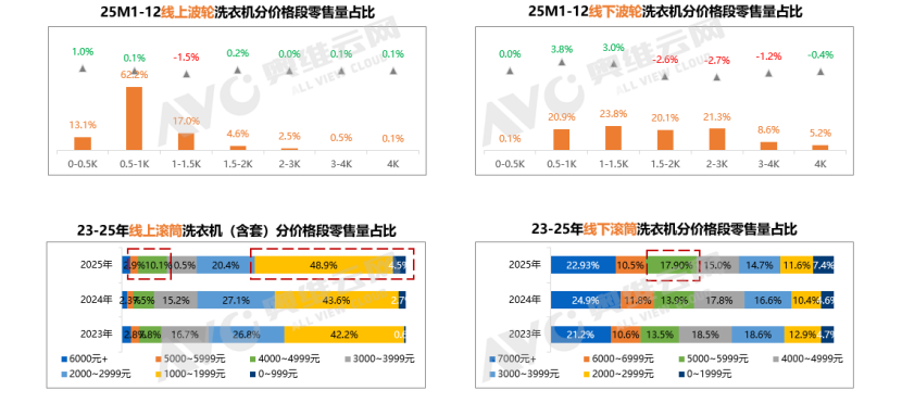 价格方面,线上市场呈现出明显“K型”分化:一方面,极具性价比的低端产品份额持续扩大;另一方面,具备分区洗等创新功能的中高端产品(如4-6K价格段)也逆势增长。这反映出消费者正变得更为理性,要么追求极致性价比◁○,要么为真正解决痛点的创新买单==◇。而线下滚筒市场则凭借其体验优势,5-6K中端价格段仍有增幅。