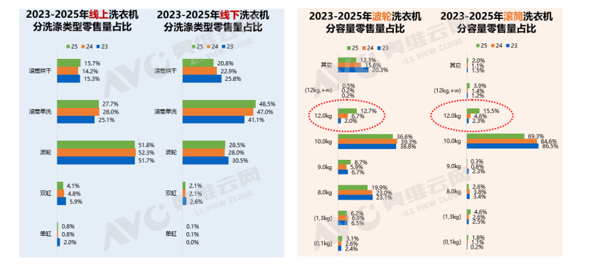 产品形态方面,线上以◁“洗烘一体机”小幅增长,追求空间的集约与使用的便捷;而线下则出现了“单洗”产品占比回升的迹象=。同时,▼“大容量”正在加速渗透•,成为不可逆的潮流。