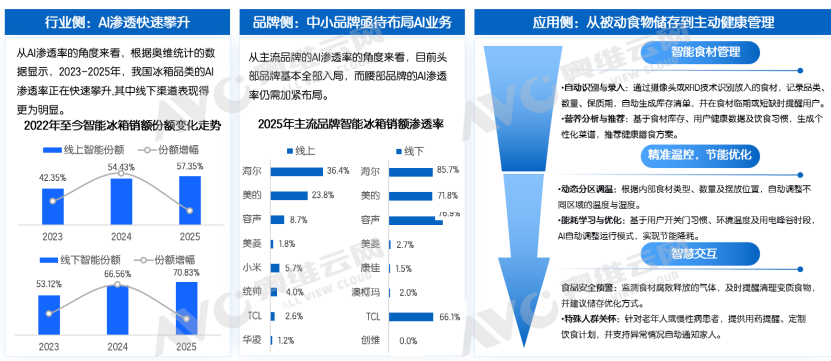 从AI渗透率的角度来看•,根据奥维统计的数据显示,2023-2025年,我国冰箱品类的AI渗透率正在快速攀升,其中线下渠道表现得更为明显□•…,根据奥维云监测数据显示,2025年,线上智能冰箱零售额占比已达57▪-.35%、线%。从主流品牌的AI渗透率的角度来看▽•▽,目前头部品牌基本全部入局,而腰部品牌的AI渗透率仍需加紧布局。