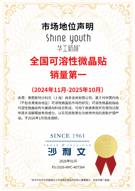 作者:艾佛森贝博ballbet官网 日期:2026-02-08 浏览: 来源:艾弗森ballbet近日,弗若斯特沙利文(Frost & Sullivan)发布的权威市场报告显示,在快速崛起的可溶性微晶(又称可溶性微针)赛道中,华工新颜凭借全链路布局、核心技术突破及强劲的市场表现,2024年到2025年销量第一,稳居市场占有率首位,成为国内可溶性微针行业的领军品牌。