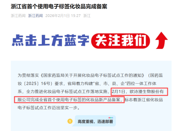 正是基于这样系统性的创新布局与前瞻性的数字基建,欧诗漫才能在此次电子标签政策落地之际率先突破,从2025年10月政策发布到与爱创科技牵手合作,再到现如今成功备案,在短短3个月内展现出卓越的响应速度,成为浙江省首个获得通过的化妆品电子标签企业项目,再次印证了“数字化不止于技术,更是持续进化的战略能力”。